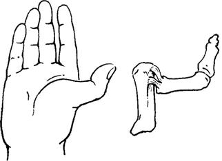 разогнут у основания, согнут в межфаланговом сочленении и напоминает форму штыка (Рис.67).