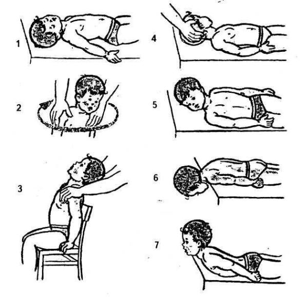1.Ребенок лежит на спине (на кушетке или столе), мать удерживает его надплечья в фиксированном положении, методист мягко, с легкой вибрацией поворачивает голову ребенка в направлении пораженной стороны, затем — в