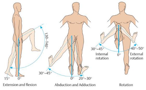Ротация кнаружи на 60°, внутрь 45° (зависит от эластичности и