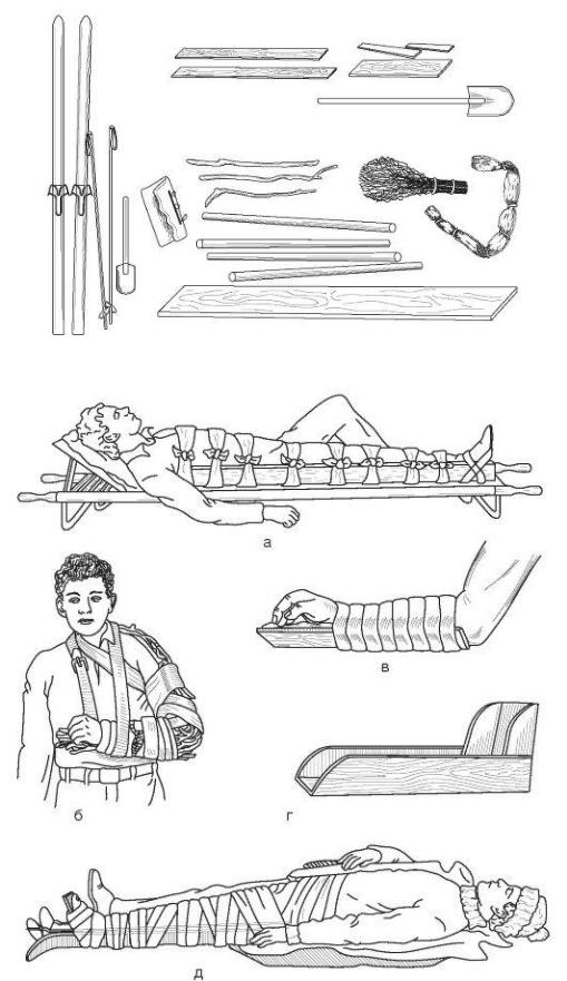 Рис. 15. Иммобилизация импровизированными шинами: а - из досок; б - из хвороста; в - из фанеры; г - из картона; д - из лыж и лыжных палок.