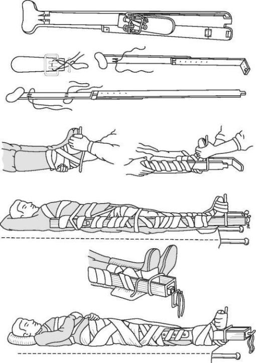укрепленные за металлическую рамку на фанерной подошве, пропускают через отверстие в подвижной части внутренней бранши. В петлю шнура вставляют палочку-закрутку. Осторожно вытягивают поврежденную конечность руками по длине. Вытяжение осуществляют до тех пор, пока накостыльники плотно не упрутся в подмышечную впадину и промежность, а длина поврежденной конечности не будет равна длине здоровой. Шнур укорачивают скручиванием,