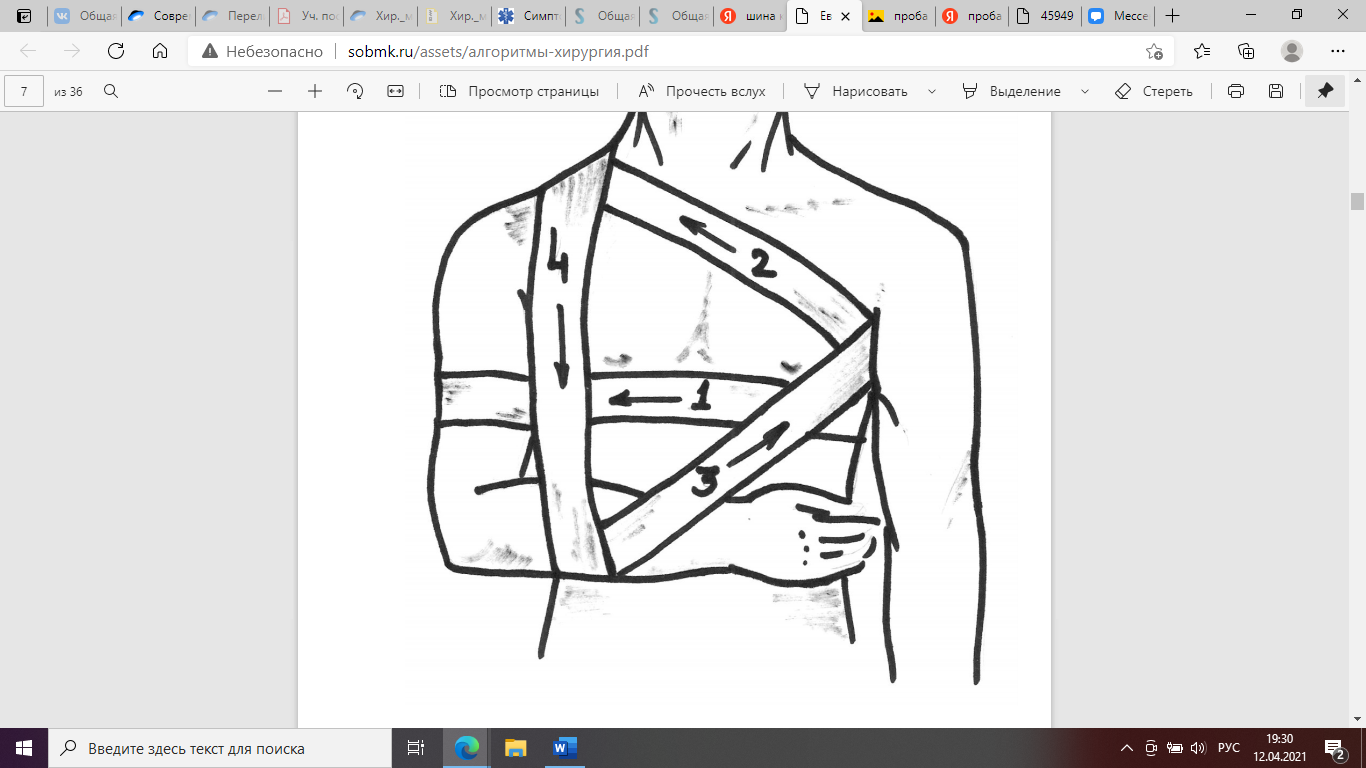 5. Сделать два закрепляющих тура бинта по груди, больной руке в области плеча, спине и подмышечной впадине со стороны здоровой конечности.