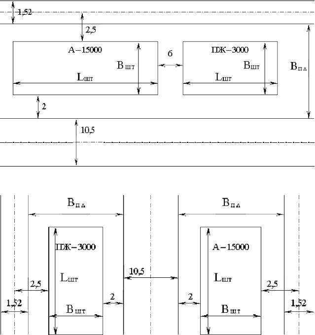 Ширина штабеля ВШТ розраховується як різниця ширини площадки ВПЛ і відстаней від залізничних та підкранових колій.