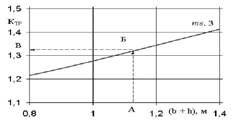 1,13. Відкладаємо це значення на горизонтальній осі графіка(вісь (b + h), м) – точка А (рис. 2). Від точки А проводимо угору перпендикуляр(вертикальну лінію) до кривої лінії, яка відповідає твіндеку № 3 (крива лінія з індексом тв. 3) і знаходимо точку перетинання Б (рис. 2). Від точки Б проводимо горизонтальну лінію (уліво) до перетинання з вертикальною віссю(вісь КТР) й знаходимо точку В (рис. 2).