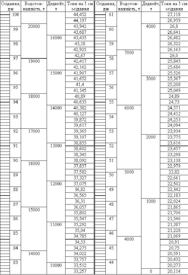 За довомогою вантажної шкалі (рис. 3) або гідростатичних таблиць за середнім осіданням (ТСР) визначається водотоннажність D0.
