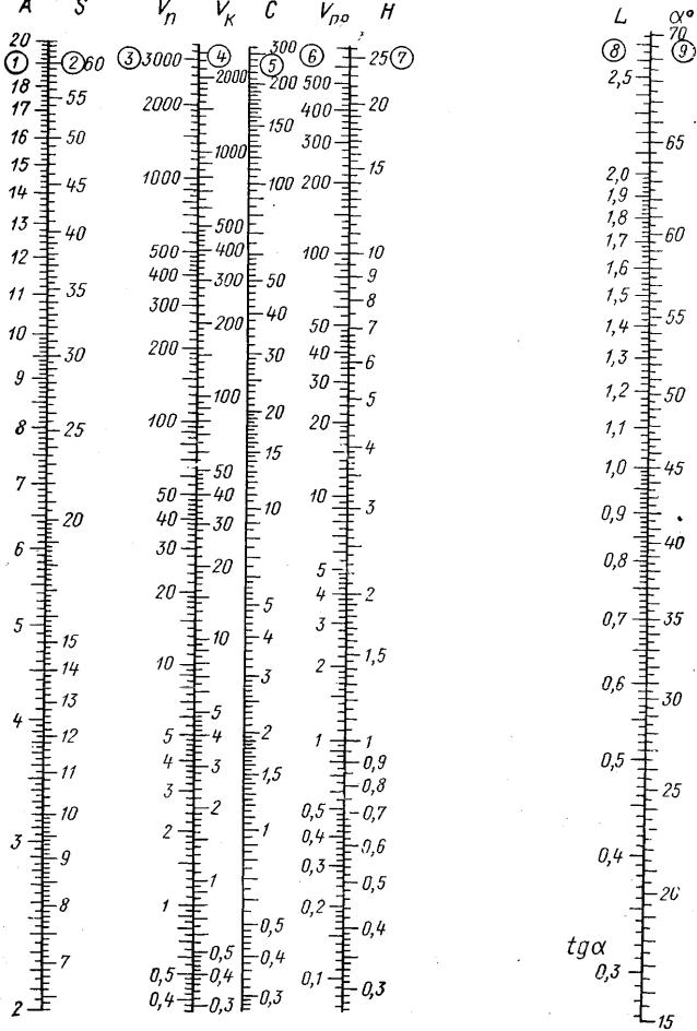 Значення тангенса кута природного укосу a знімаються зі шкали 8 напроти значення a шкали 9 з максимальною точністю.