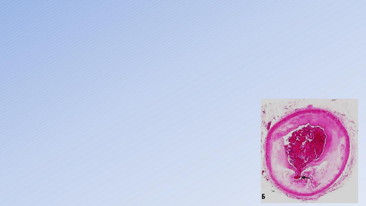 атеросклеротическая бляшка коронарной артерии с частичной или полной окклюзией тромбом просвета сосуда (Б).