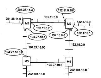 У цій мережі є вісім IP-мереж, пов'язаних чотирма маршрутизаторами з ідентифікаторами: M1, М2, М3 і М4. Маршрутизатори, що працюють по протоколу RIP, можуть мати ідентифікатори, однак для роботи протоколу вони не є необхідними. У RIP-повідомленнях ці ідентифікатори не передаються.