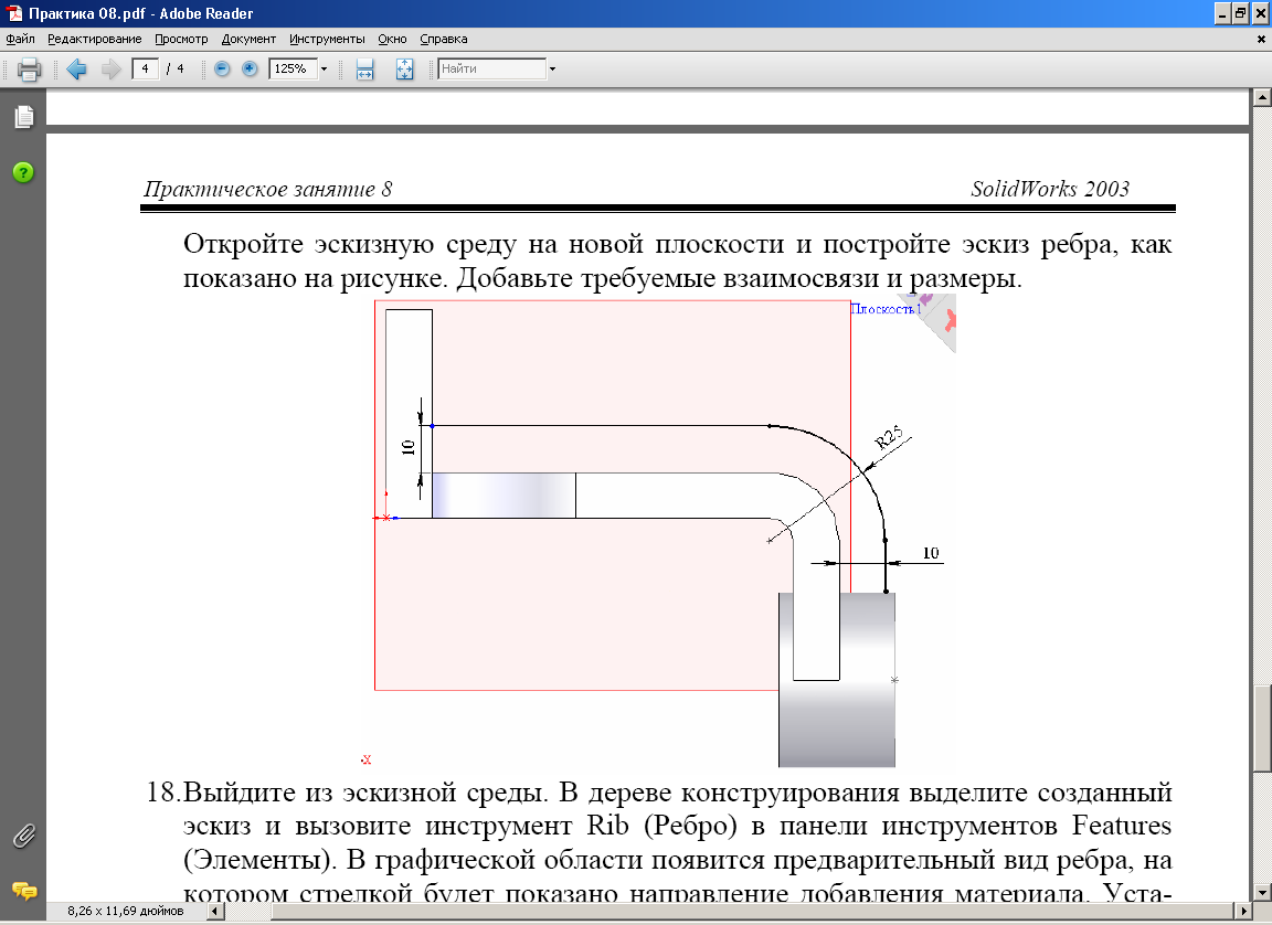 Вийдіть із ескізного середовища|середи|. У дереві конструювання виділіть створений ескіз і викличте|спричиняйте| інструмент Rib| (Ребро) на панелі інструментів Features| (Елементи). У графічної області з'явиться|появлятиметься| попередній вид|вид| ребра, на якому стрілкою буде показано напрям|направлення| додавання|добавляти| матеріалу. Установіть прапорець Flip| material| side| (Переставити сторону для матеріалу) і задайте| значення товщини 10 мм.