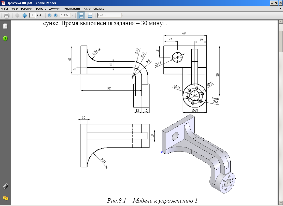 Необхідно створити модель литої деталі. Розміри моделі вказані на малюнку 8.1|мінути|.