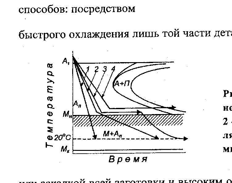 Если выдержку проводят ниже точки начала мартенситного превращения, то длительность выдержки не имеет существенного значения. Такой способ охлаждения существенно снижает коробление деталей. Схематически режим ступенчатой закалки показан кривой 3 на рис.4.2.