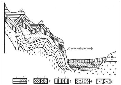 1 – відклади палеогену; 2 – відклади неогену; 3 – четвертинні відклади; 4 – відклади складчастої основи гірської країни; 5 – відклади платформи: