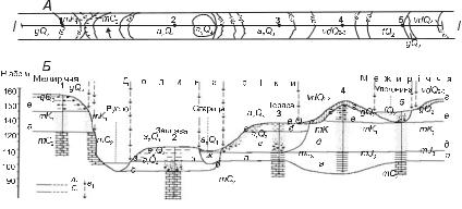 Рис. 6. Схема нанесення на профіль (Б) відомостей про геологічну будову земної кори за даними бурових свердловин і геологічної карти (А):