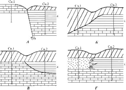 Б– виклинювання пласта внаслідок розмивання; В – виклинювання у місці проходження природної межі (берегової лінії озера, моря, краю льодовика тощо);