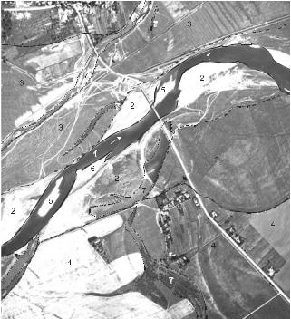 Елементи і форми рельєфу: 1 – русло ріки; 2 – низька заплава; 3 – висока заплава; 4 – перша надзаплавна тераса; 5 – острови у руслі; 6 – побочень; 7 – стариці