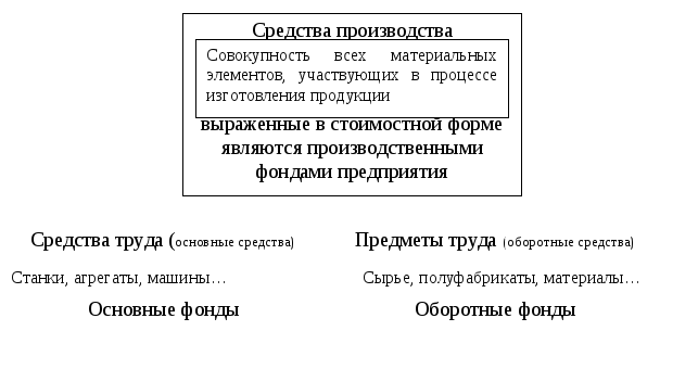 Средства производства, выраженные в стоимостной форме, представляют собой производственные фонды предприятия. Производственные фонды делятся на основные (стоимость средств труда) и оборотные (стоимость предметов труда).