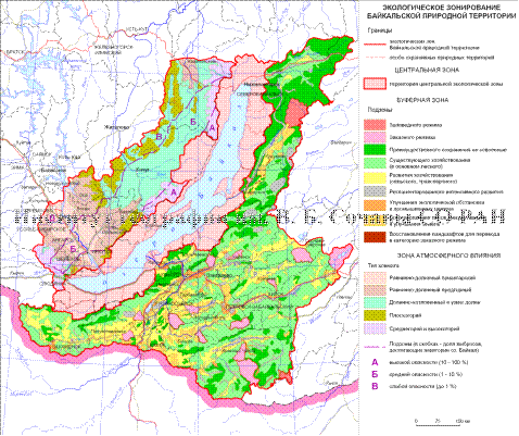 Экологическое зонирование- деление территорий на участки, которые нужны для сохранения современного состояния использования территории, участки с ограниченной хозяйственной деятельностью человека, так как есть возможность вредного воздействия на экосистему Байкала и участки с острыми экологическими проблемами, которые изымаются для проведения восстановительных мероприятий.