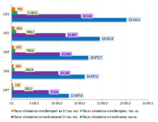 За последние годы стремительно растет число абонентов сотовой связи; в 2011 году их было 25 240,4 тыс. За год количество абонентов сотовой связи увеличилось на 30,1%, объем услуг - на 15,7%. К концу 2011 года в республике насчитывалось 1 261,5 тыс. абонентов сети Интернет, из них абоненты широкополосного Интернет - 94,6% [134] (рисунок 18).
