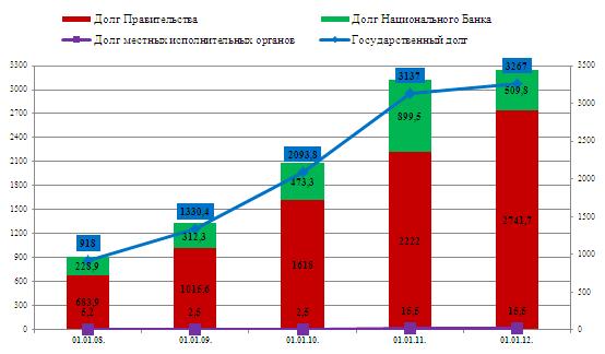 При этом наблюдается рост сумм государственного долга Казахстана по всем заемщикам. Наибольшие суммы проходят по государственному долгу Правительства Республики Казахстан. Государственный долг Правительства увеличился с 683 866 млн. тенге в 2007 году до 2 741 696 млн. тенге в 2011 году [136] (рисунок 20).