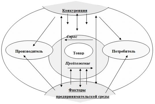Конкуренция воздействует на предпринимателя через механизм спроса и предложения, который во многом зависит от воздействия внутренних и внешних факторов предпринимательской среды. Получается, что внешние и внутренние факторы предпринимательской среды, через механизм спроса и предложения, воздействуют на конкуренцию.
