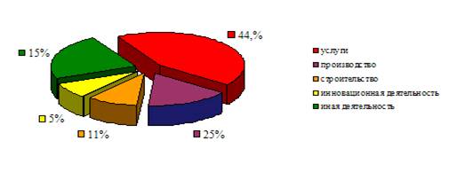 Субъекты малого предпринимательства размещенные на площадях инкубатора (Рис.2) -это предприниматели занятые в сфере услуг-44%, в производстве-25%, в строительстве-11%, инновационная деятельность -5%, иная деятельность-15%.