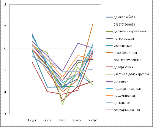 Рис.2.2.6. Динамика представлений студентов разных курсов о собственной группе, с минимальной выраженностью на 3 курсе.