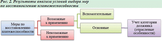 . Разработка мер по восстановлению платежеспособности по результатам двух предыдущих этапов. В целях разработки тактики восстановления платежеспособности организации проводится анализ возможности применения каждой из существующих и возможных к применению мер восстановления платежеспособности (рис. 2) [1].
