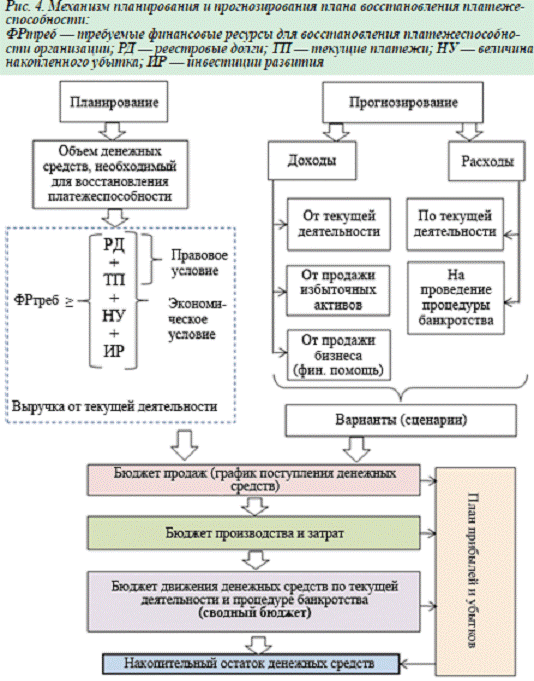 и 6. Планирование результатов (в том числе расходы на реализацию мер), прогнозирование результатов. На обоих этапах разрабатывается финансово-экономическое обоснование возможности восстановления платежеспособности организации с учетом плана мер, производственного, маркетингового и финансового планов, определяются финансово-экономические результаты функционирования организации в ходе восстановления платежеспособности, в том числе расходы на реализацию мер (проведение процедур банкротства). По результатам обоих этапов формируется сводный бюджет доходов и расходов, в котором отражается величина накопленных денежных средств для погашения требований кредиторов. На данных этапах также необходимо обосновать различные сценарии реализации тактики восстановления платежеспособности и представить возможные результаты каждого сценария.