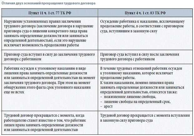 Следует обратить внимание на то, что увольнение в подобной ситуации следует отличать от прекращения трудового договора в связи с осуждением работника на наказание, исключающее продолжение прежней работы, в соответствии с приговором суда, вступившим в законную силу. Такое основание предусмотрено п. 4 ч. 1 ст. 83 ТК РФ (Таблица 1).