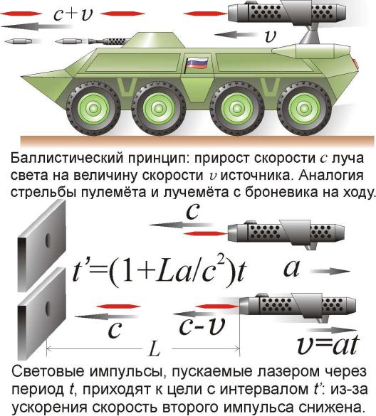 Согласно Вальтеру Ритцу движение света аналогично движению снарядов, пуль. Эта аналогия с баллистикой отражена и в ряде современных лазерных терминов: «световые пули», «лазерные пушки» и т.д.