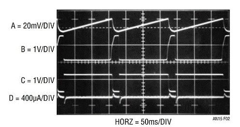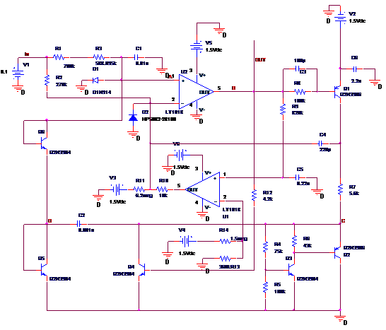 На вход подается 0 В до 1 В, а с выхода снимаем от 25Гц до 10кГц, с передачей линейности 0,35%. Усиление дрейфа 250ppm /° C и потребление тока около 205μA. Чтобы понять работу схемы, предположим, положительный вход С1 в немного ниже его отрицательного входа (выхода С2 находится на низком уровне). Входное напряжение вызывает положительные пилообразные импульсы в С1 положительный вход (трассировки, рисунок 2). Выход C1 в (трассировки В) низкий, смещения Q1 на. Ток коллектора Q1 в управляет Q2-Q3 Сочетание, заставляя излучатель Q2 в (трассировки С), чтобы зажать в 1V. В 0.001μF конденсатор заряжается до земли (0.001μF устройства форма тока является трассировки D) с помощью Q5. Когда рампа на положительный вход С1 идет достаточно высоко, выход C1 идет высокая, отрезав Q1, Q2 и Q3. _____________________________.100 пФ конденсатор на коллекторе Q1 в снабжает переменного тока положительной обратной связи, обеспечение того, чтобы выход C1 остается положительным достаточно долго для полного разряда 0.001μF конденсатора. Диод Шоттки предотвращает вход С1 от гонят за пределами ее пределом отрицательной общего режима. Это действие отключает Q4, Q1-Q3 давай и весь цикл повторяется. Частота колебаний напрямую зависит от входного напряжения получены тока. Температура коэффициент коэффициент поглощения Q2-Q3 1V зажима в значительной степени компенсируется распределительных tempcos из Q5 и Q6, чтобы уменьшить общее дрейф температуры. 270k путь резистор обеспечивает входного напряжения, полученный точку срабатывания для С1, повышения производительности цепи линейности. Этот резистор должны быть выбраны для достижения цитирует линейность. Цепь запуска или овердрайв может вызвать переменному току петля обратной цепи, чтобы защелка. Если это произойдет, выходная C1 идет высокими. С2 обнаруживает это, через 820k-0.22μF лагом, а также идет высокими, поднимая отрицательный вход С1 по отношению к 1,5. Потому что положительный вход C1 является диод фиксируется на 600 мВ, его выход переключается низкий, инициируя нормальное поведение схемы. Для калибровки эту схему, выберите 100k значение для VCLAMP= 1В. Затем примените 2,5 мВ на входе и выберите значение резистора, указанный на входе С1 для выхода 25 Гц. Затем положить в точно 1V и отделка потенциометра 500kΩ для вывода 10 кГц.