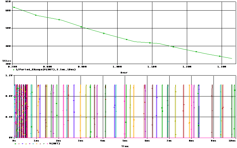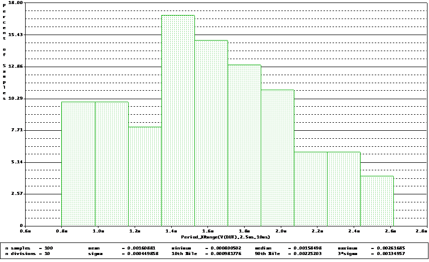 ) Влияние разброса параметров на частоту при фиксированном входном напряжении.