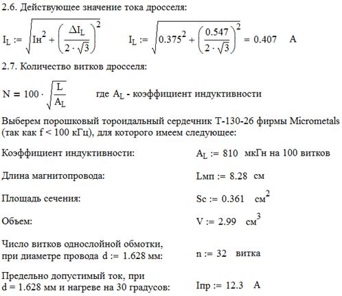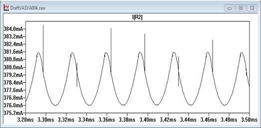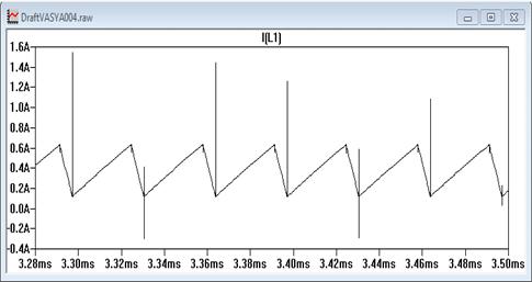 На рисунке 5.2 а видно, что при γ = 0.7 (tи = 23.33∙10-6 с) ток через дроссель имеет отрицательные значения, что в принципе не может быть. Это объясняется изъянами самой программы, исключая которые можно сказать о наличии прерывистого характера изменения тока в индуктивности. При γ ≥ 0.71 отрицательных значений не наблюдается, что говорит о непрерывном режиме изменения тока (рисунок 5.2 б).