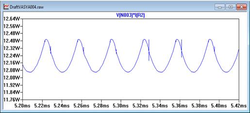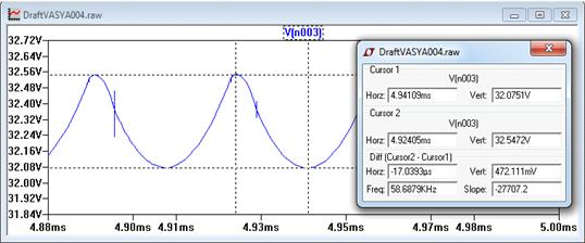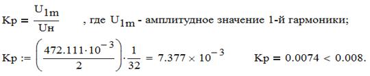 Из рисунка 4.11 определим коэффициент пульсаций Kp на нагрузке R2. Данное значение не должно превышать заданного расчётного значения Kp = 0.008. Коэффициент пульсаций рассчитывается по следующей формуле и для нашего случая равен: