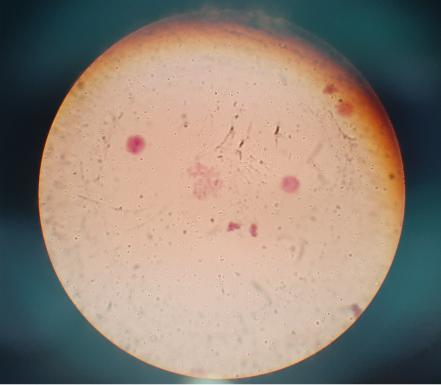При малом увеличении микроскопа (объектив 8х) видно большое количество эритроцитов: это розовые клетки округлой формы и без ядер. Среди многочисленных эритроцитов видны лейкоциты – бесцветные клетки с темноокрашенными ядрами.