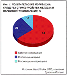 Покупка самых популярных препаратов от расстройства желудка и при нарушений пищеварения является прежде всего результатом собственного решения потребителей, основанного на «хорошем» знании брендов (65% покупателей сказали, что видели рекламу соответствующего препарата). Еще четверть опрошенных прислушиваются к рекомендациям врачей и только 10% считают значимыми рекомендации фармацевтов. В то же время многие люди (26%) отмечают преимущественное влияние рекомендаций врача при выборе препарата.