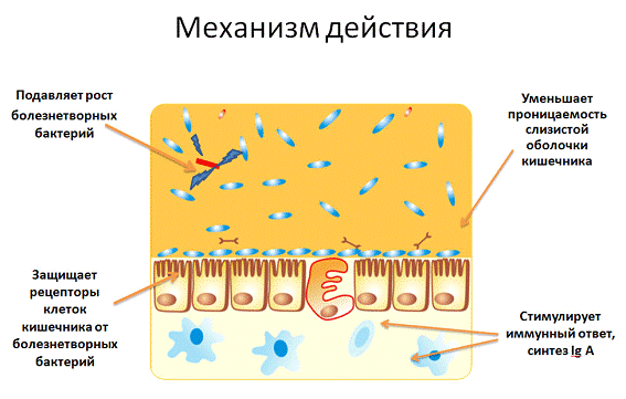 Пробиотики обладают разносторонним фармакологическим действием. Положительный эффект пробиотиков обусловлен их участием в процессах пищеварения и метаболизма организма-хозяина, биосинтезом и усвоением белка и многих других бав, обеспечением резистентности макроорганизмов. Нормальная деятельность многих систем и органов в значительной степени зависит от видового состава и межвидового соотношения микроорганизмов, заселяющих их с момента рождения.