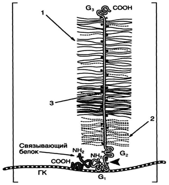 •В основе агрегата – нить гиалуроновой кислоты (1). К ней присоединяются 130 цепей