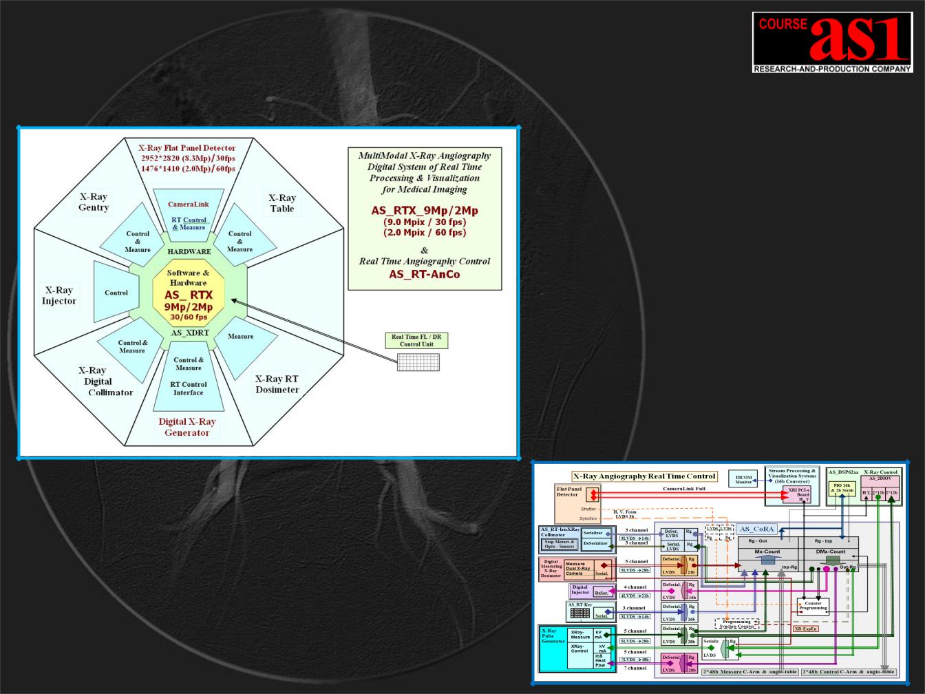 На верхнем рисунке показана архитектура интерфейса контроля и управления реального времени, обработка и визуализация системы и частей ангиографического аппарата или других рентгеновских систем.