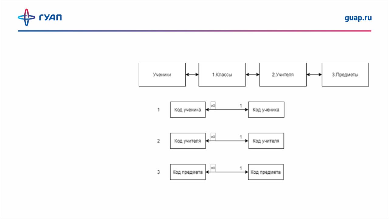 Классы: Код класса Предметы: Код предмета Ученики: Код учителя Учителя: Код учителя