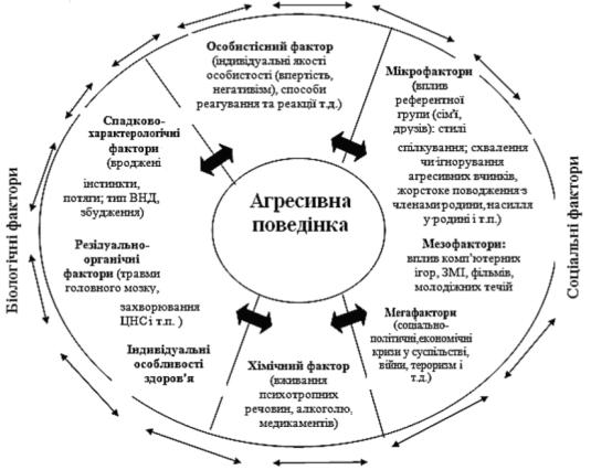 Аналіз наукових досліджень показав, що різноманітність причин, що сприяють появі та розвитку агресивної поведінки обумовлені різними підходами до вивчення самого явища агресії. Умовно ці причини можна класифікувати в загальні фактори: біологічні, соціальні, особистісні (психологічні) та хімічні.