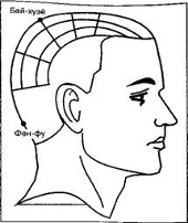 Точка бай-хуэй («место встречи 100 меридианов») - нормализует кровообращение, снимает головную боль, помогает при бессоннице. Она располагается на пересечении средней линии головы и вертикальной плоскости, проходящей через самые высокие точки ушей, на 7 цуней выше задней границы (самая вершина темени, на макушке).