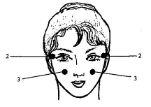 Воздействие проводится в легкой форме кончиками пальцев рук синхронно с двух сторон, попеременно воздействуя на каждую точку в течение 1 минуты.