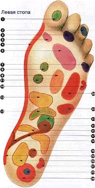 1. Гипофиз 2. Мозг 3.Глаза 4. Шейный отдел позвоночника 5.Трахея 6. Легкие 7. Уши 8. Щитовидная железа 9. Тимус (вилочковая железа) 10.Плечи 11. Паращитовидная железа 12. Желудок 13.Панкреас 14.Надпочечники 15.Почки 16. Кишечник 17. Мочеточники 18. Мочевой пузырь 19. Половая сфера 20. Тонкий кишечник 21. Бедра и колени 22. Крестцовый отдел позвоночника 23. Седалищный нерв 24. Костная система 25.Печень (только на правой стопе) 26. Желчный пузырь (только на правой стопе) 27.Аппендикс (только на правой стопе) 28. Сердце (только на левой стопе) 29.Селезенка (только на левой стопе)