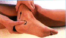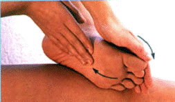 стороне стопы большим пальцем левой руки. Начинать от нижнего края свода стопы