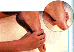 . Нащупать указательным пальцем сухожилия большого и второго пальцев ноги и надавить между ними. То же самое проделать со следующими двумя ложбинками. Остальные ложбинки надавливать точно так же, но заведя руку с другой стороны: большой палец по-прежнему остается снизу.