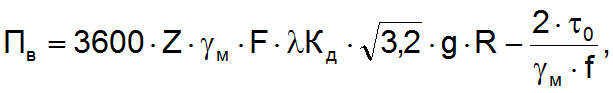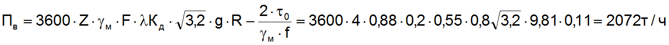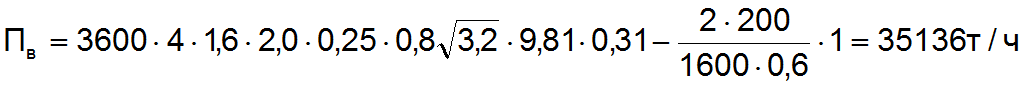 П = Кп х (0,9В - 0,05)2 х V x гамма х Кбета = = 470 х (0,90,63 - 0,05)2 х 2 х 1,03 х 0,97 = 254 т/ч.