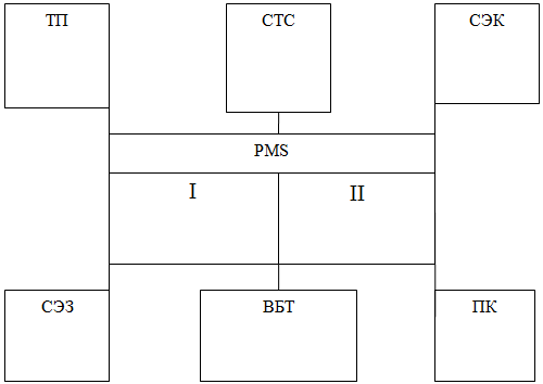 Рис.1 Структура системы управления гостиницей (I -внешние службы, бронирование, управление номерным фондом, расчеты с клиентами, общее управление; II- внутренние службы, ведение общего бухучета, расчеты по з/плате, контроль на складах, финансовые отчеты) [1]