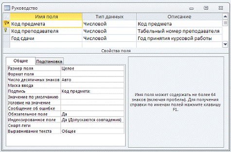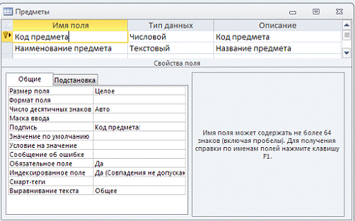 Рисунок 2.16 - Структура таблицы «Предметы»