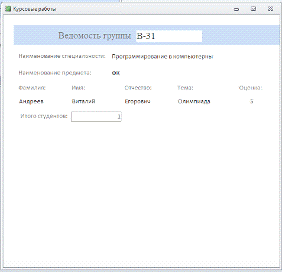 · Формирование и вывод документа «Ведомость сдачи курсовых работ группы»;